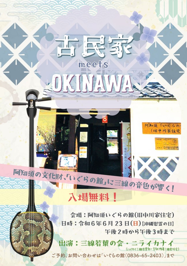 「沖縄慰霊の日」の6月23日に沖縄音楽を楽しんでもらいたいとの思いで、山口市や宇部市とその近隣で沖縄音楽の演奏活動をされている「三線若葉の会」と「ニライカナイ」の皆さんの演奏会が開催されます。「芭蕉布」や「安里屋ゆんた」など親しみやすく、よく知られている曲を中心に、気軽に楽しめる演奏会です。