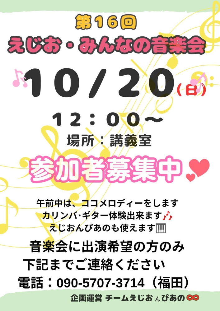 午前中はココメロディーをします。カリンバ、ギター体験できます。えじおんピアノも使えます。