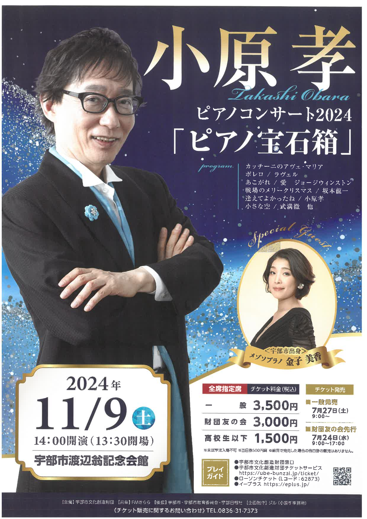 ジャンルを問わず自由に音楽を奏でるマルチピアニストの小原孝の5年ぶりとなる宇部公演を開催します。今回は、宇部市出身の声楽家金子美香を特別ゲストに迎え、癒しの空間で安らぎのひと時をお過ごしください