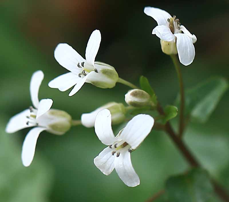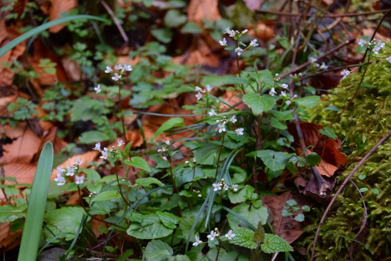 山焼き後の黒い台地の小さな芽吹きと、火の入らない帰り水で花盛りのユリワサビを観察します。