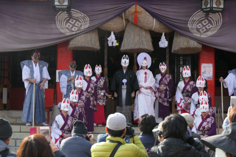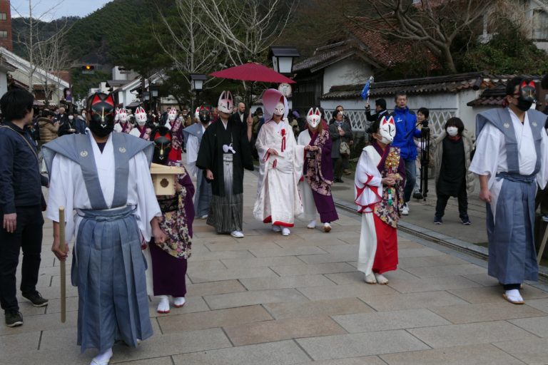 2月8日(土)に、太皷谷稲成神社の初午大祭(※2月6日)に合わせ、命婦狐の失せ物探し道中を執り行います。これは、太皷谷稲成神社に伝わる失せ物探しの伝承になぞらえて命婦狐に扮した行列が街中を歩くイベントです。