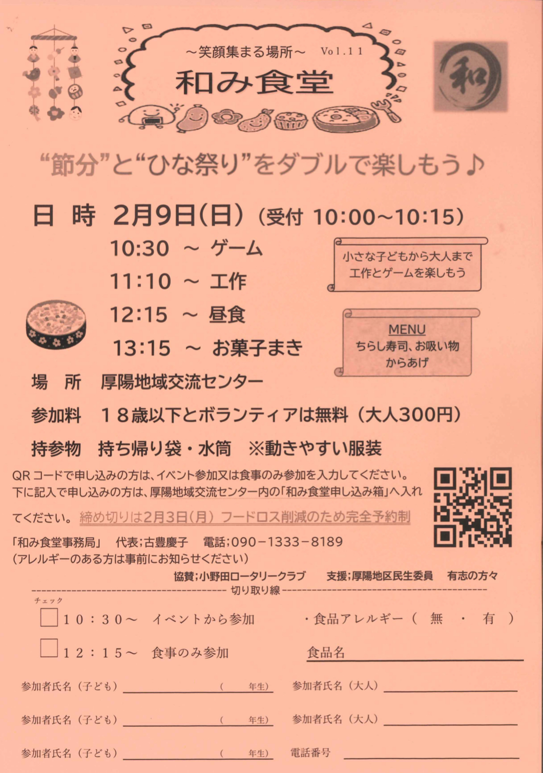 和み食堂さん主催の子ども食堂が令和7年2月9日(日曜日)に、開催されます。