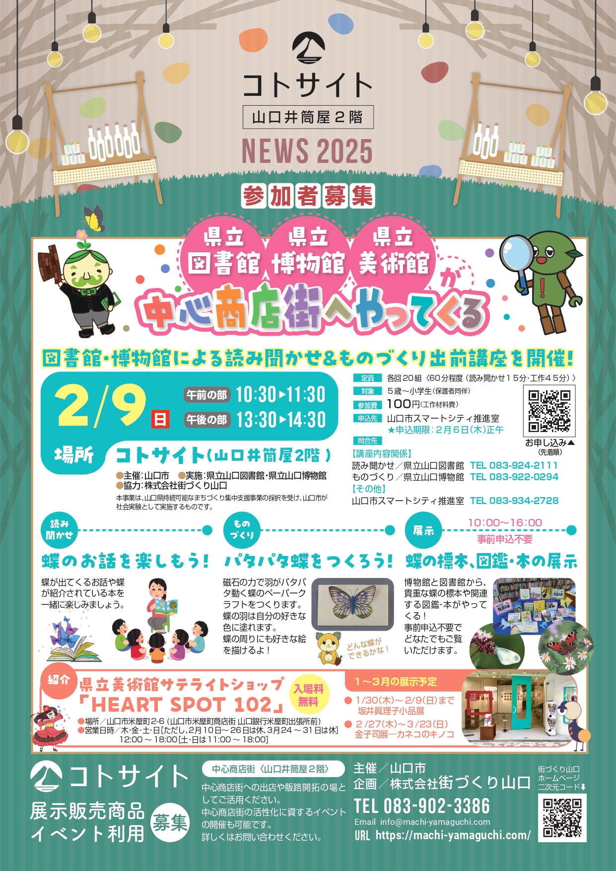 県立山口図書館による読み聞かせ講座で、蝶が出てくるお話や蝶が紹介されている本を一緒に楽しんだ後、県立山口博物館によるものづくり講座「パタパタ蝶」で、磁石の力で羽がパタパタ動く蝶のペーパークラフトを作ります。