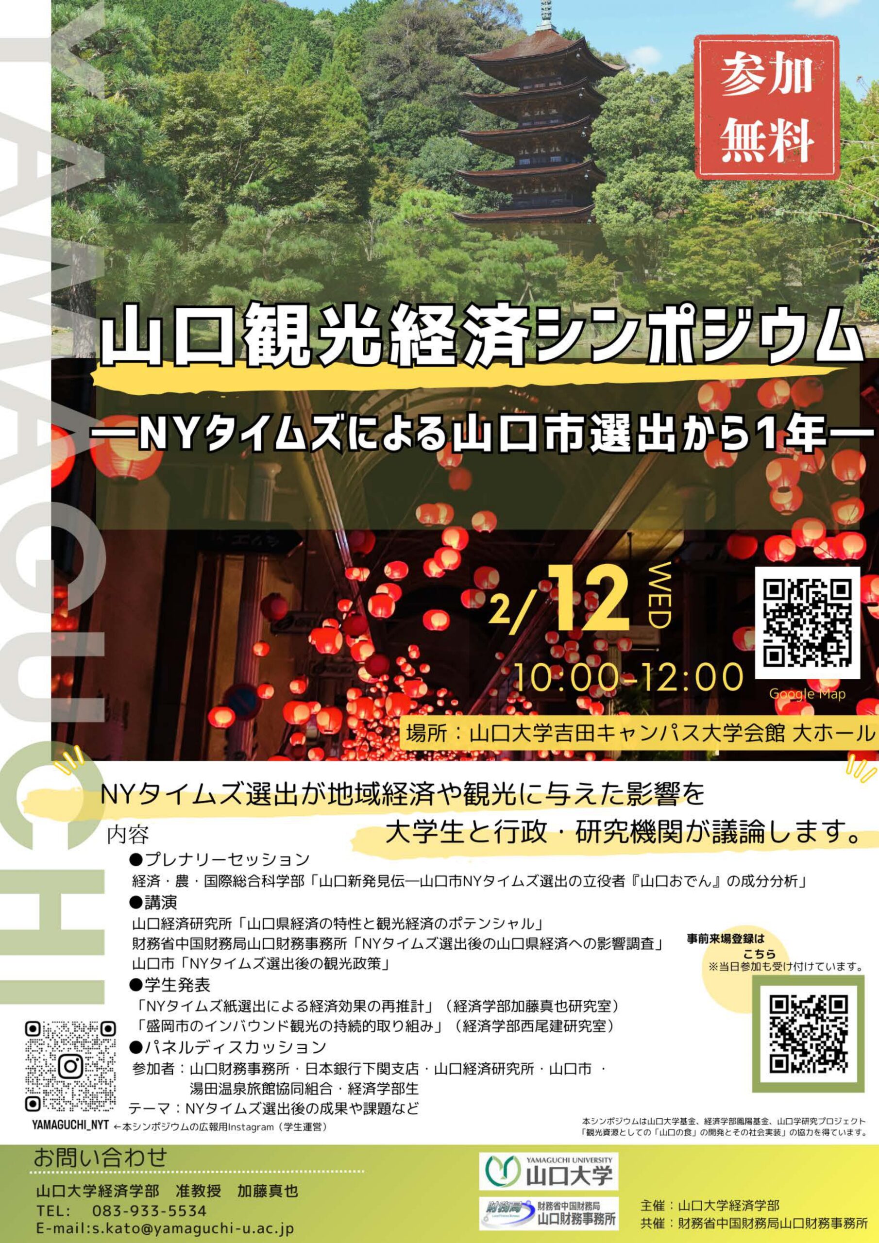 2月12日(水)10時~12時に、山口大学 吉田キャンパス 大学会館 大ホールにて、「山口観光経済シンポジウム―NYタイムズによる山口市選出から1年」と題したシンポジウムが開催されます。