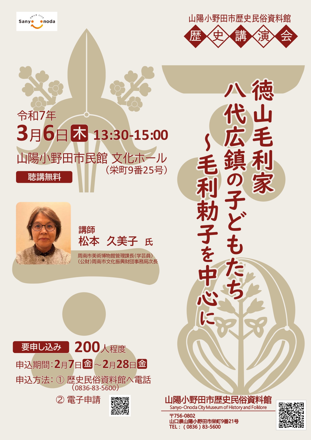 本講演会は、徳山毛利家資料を収蔵している周南市美術博物館の学芸員を招いて、専門的な歴史を紹介し、山陽小野田市の歴史について一人でも多くの方が理解を深め、興味をもってもらうことを目的とし、開催するものです。