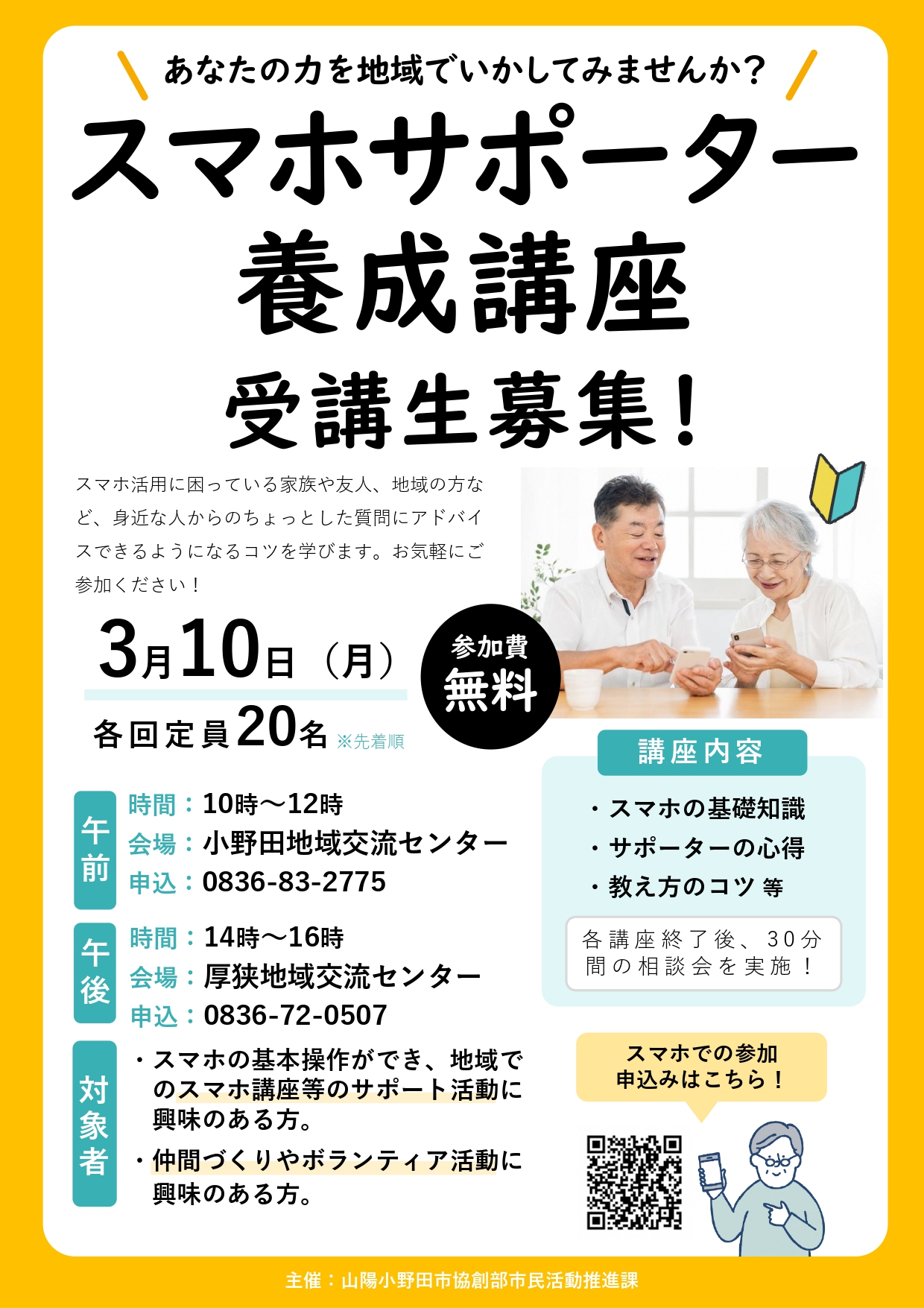 受講希望会場(小野田地域交流センター、厚狭地域交流センター)へ来所又は電話でご連絡いただくか、チラシに貼付している二次元バーコードから申し込みください。