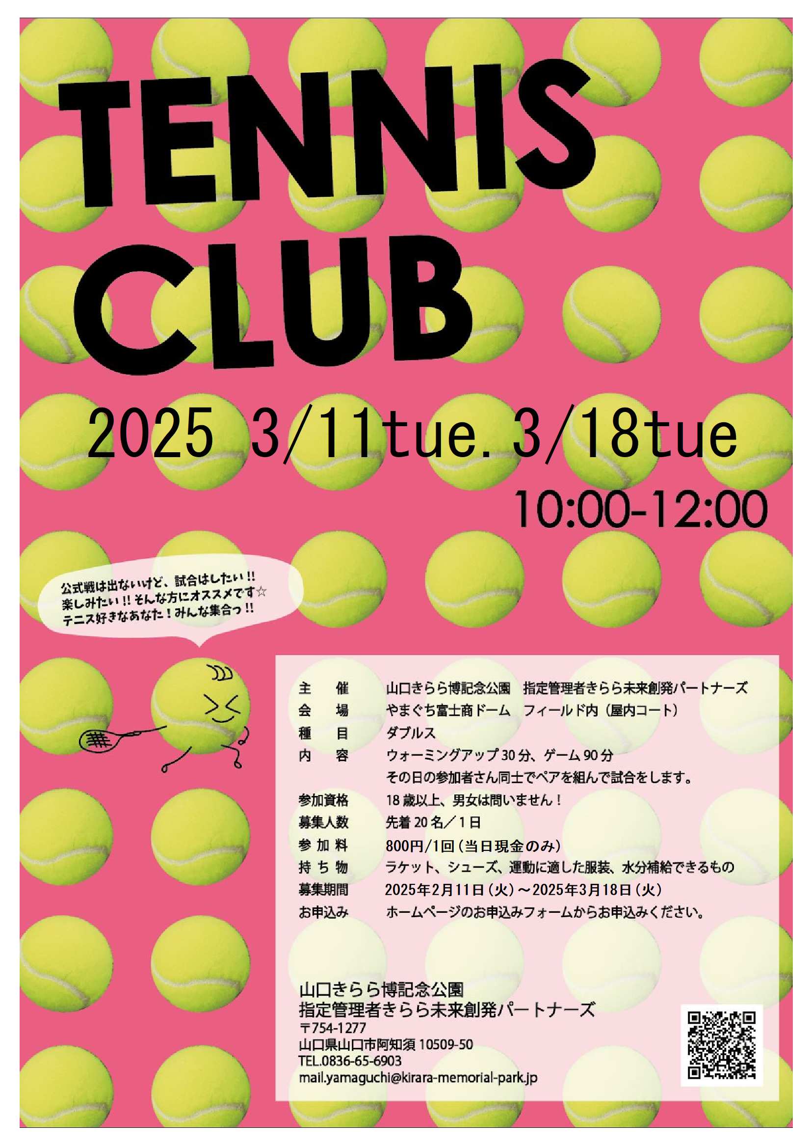 テニスクラブは30分間ウォーミングアップ、1時間30分ダブルスの試合形式を行っていく教室になります。