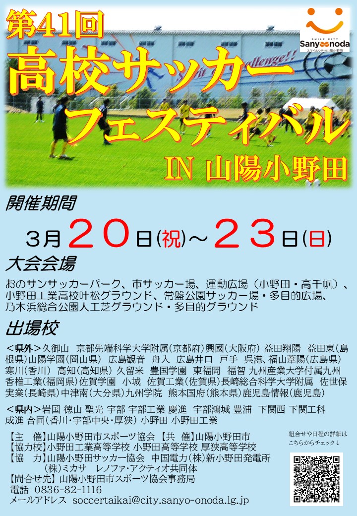• 文化スポーツ推進課です。県外29校、県内14校が参加する高校サッカーフェスティバルを3月20日(祝)~23日(日)の期間、おのサン サッカーパークなど市内外の会場で開催します。
