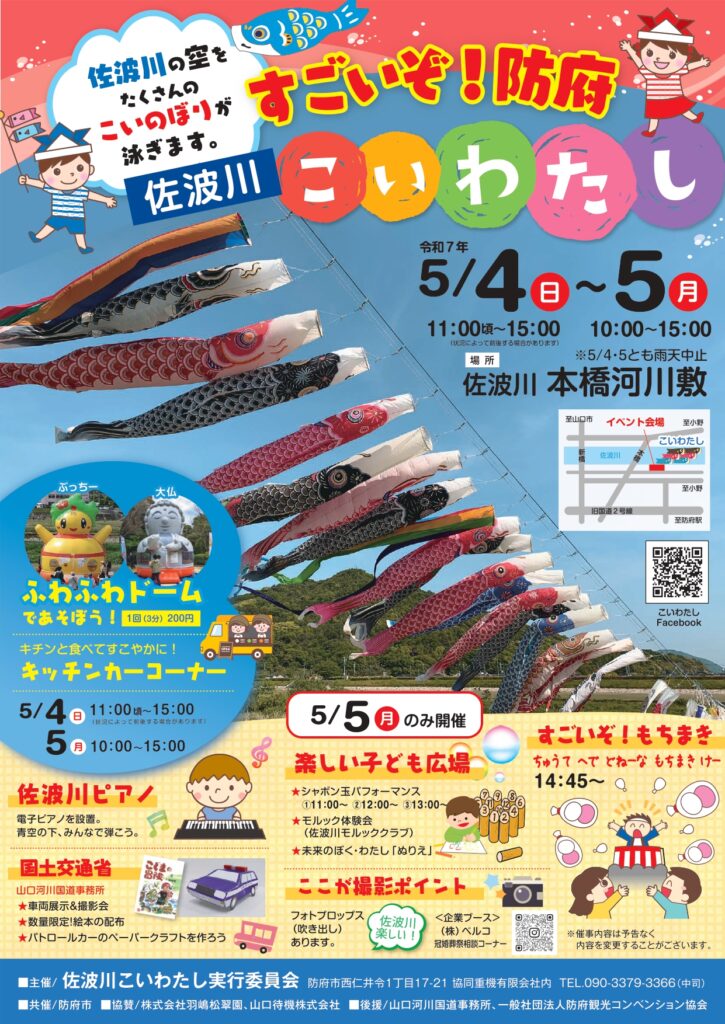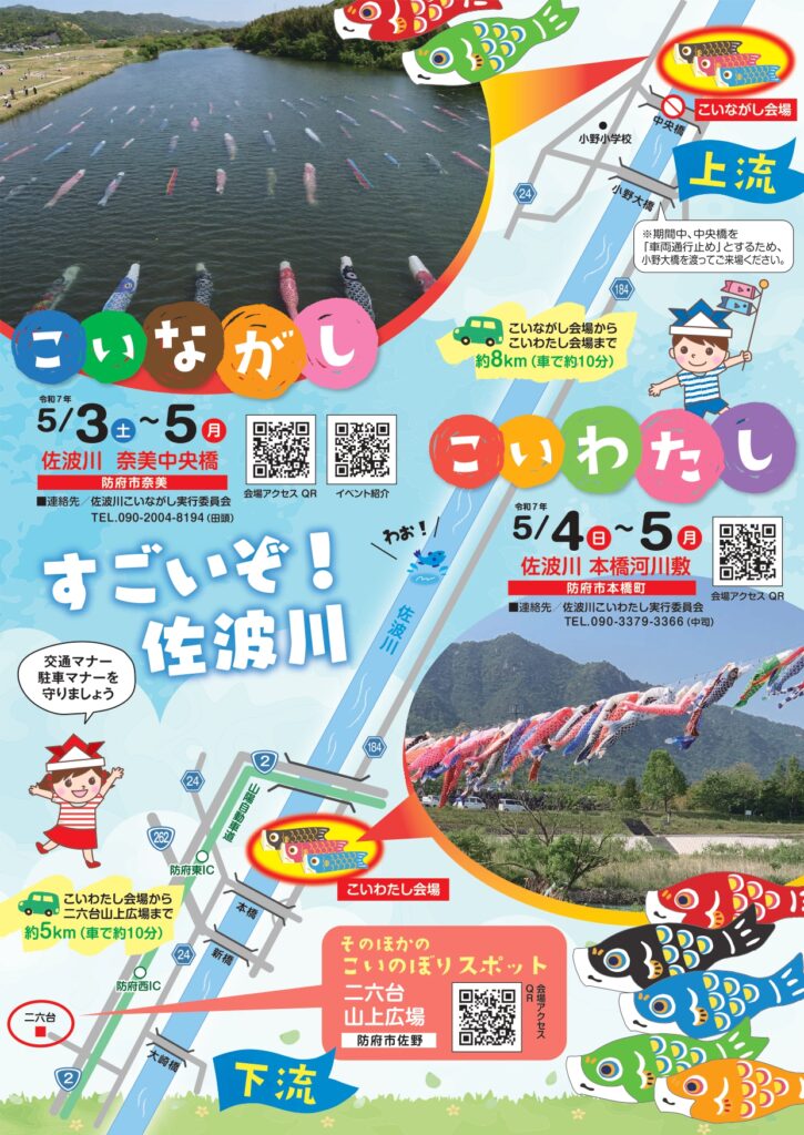 小野小学校防府市小野地区の佐波川では、毎年ゴールデンウィーク中期間限定で、約120匹のこいのぼりが川の中を泳ぐ、「水中こいのぼり」を見ることができます。