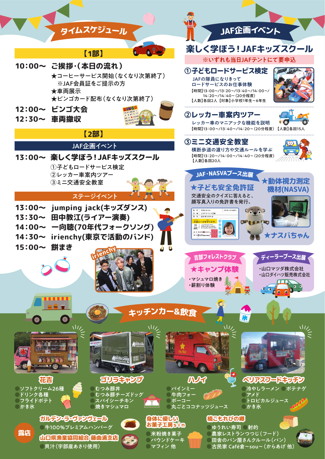 車愛好家のカーイベント・オープンカー&レトロカー展示、ビンゴゲーム大会、JAF企画イベント、ステージイベント、キッチンカーなどの飲食ブースなどなど。