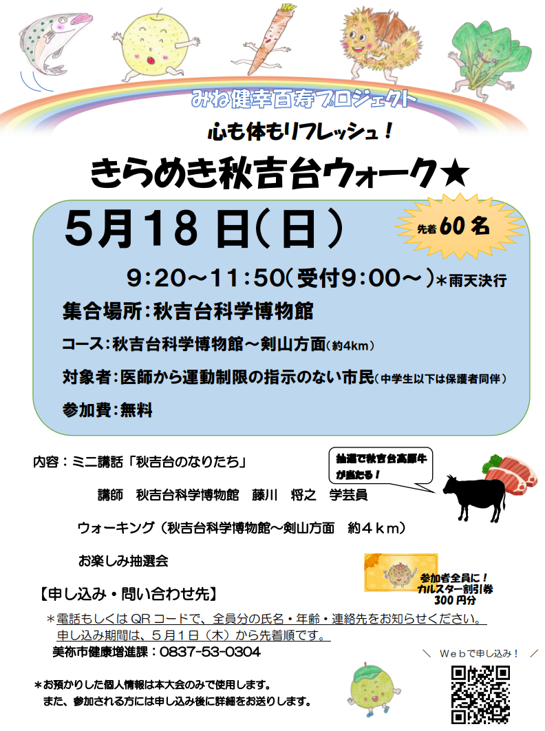 気持ちの良い秋吉台で春の訪れを感じながらウォーキングをして、心も体もリフレッシュしませんか。ウォーキング初心者も普段ウォーキングしている方もどなたでも大歓迎です。ウォーキング後は、秋吉台高原牛が当たる抽選会や嬉しい参加賞もあります!
