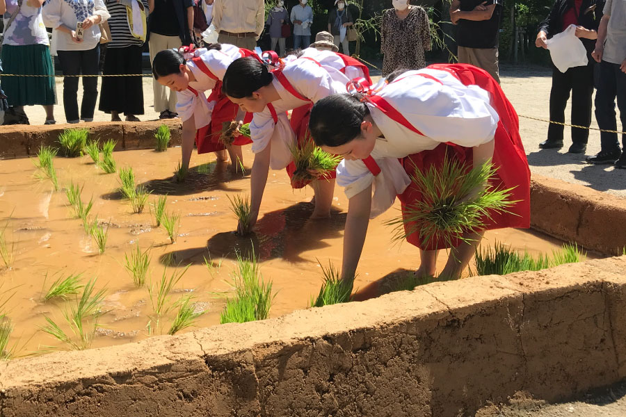 防府天満宮で行われる神事で、御田植祭(おたうえさい)は、仮水田で耕作のまねを行ない、その後に巫女が苗を植え付けする豊作を祈願する神事です。