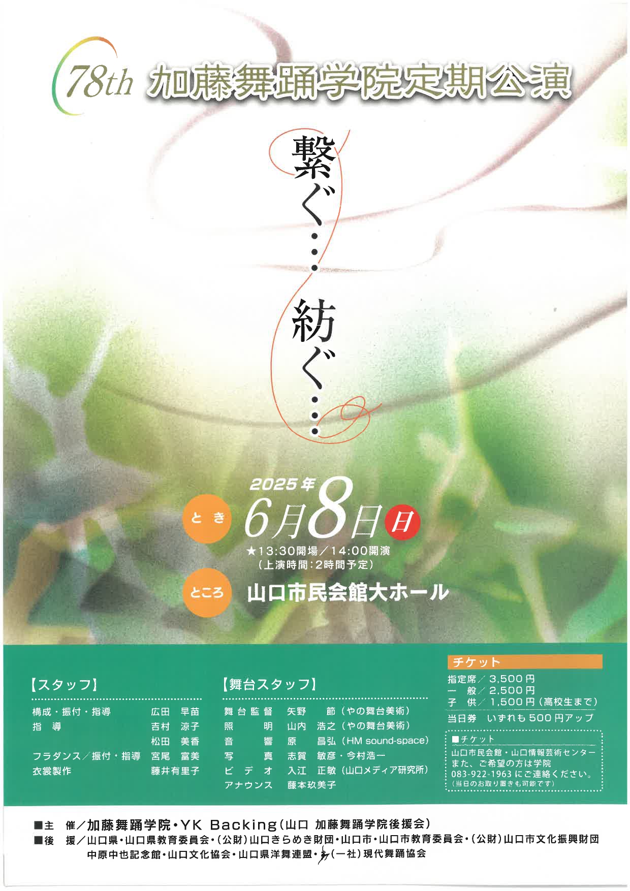 四季を彩る小品集(モダンダンス・スペイン舞踊・フラダンス)、全国大会受賞作品など、学院研究生に加え県内、中国他方各地のダンサーも参加し、世代をつなぎ、各々の想いを紡ぐ、明るく楽しい舞台をお届けします。