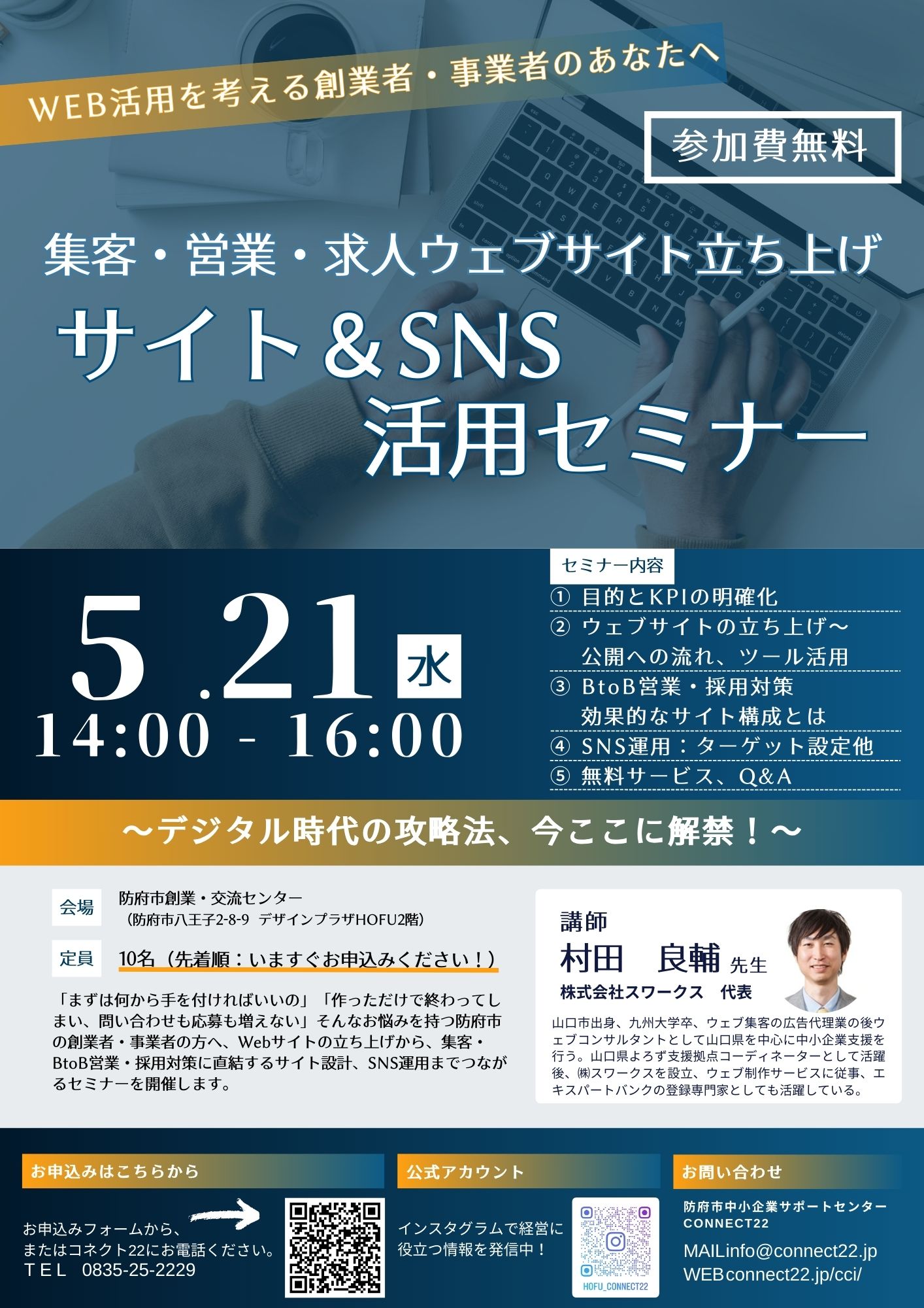 「まずは何から手を付ければいいの」「作っただけで終わってしまい、問い合わせも応募も増えない」そんなお悩みを持つ防府市の創業者・事業者の方へ、Webサイトの立ち上げから、集客・BtoB営業・採用対策に直結するサイト設計、SNS運用までつながるセミナーを開催します。