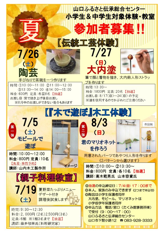- 小学3年生~中学生 各回10名(応募者多数の場合は抽選)