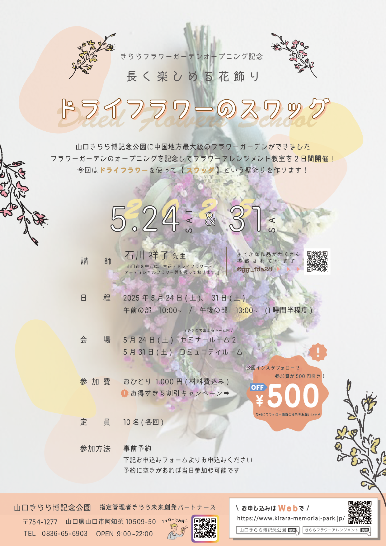 おひとり1,000円(材料費込) 公園インスタフォローで500円引きに!当日、受付にてフォロー画面の提示をお願いします。