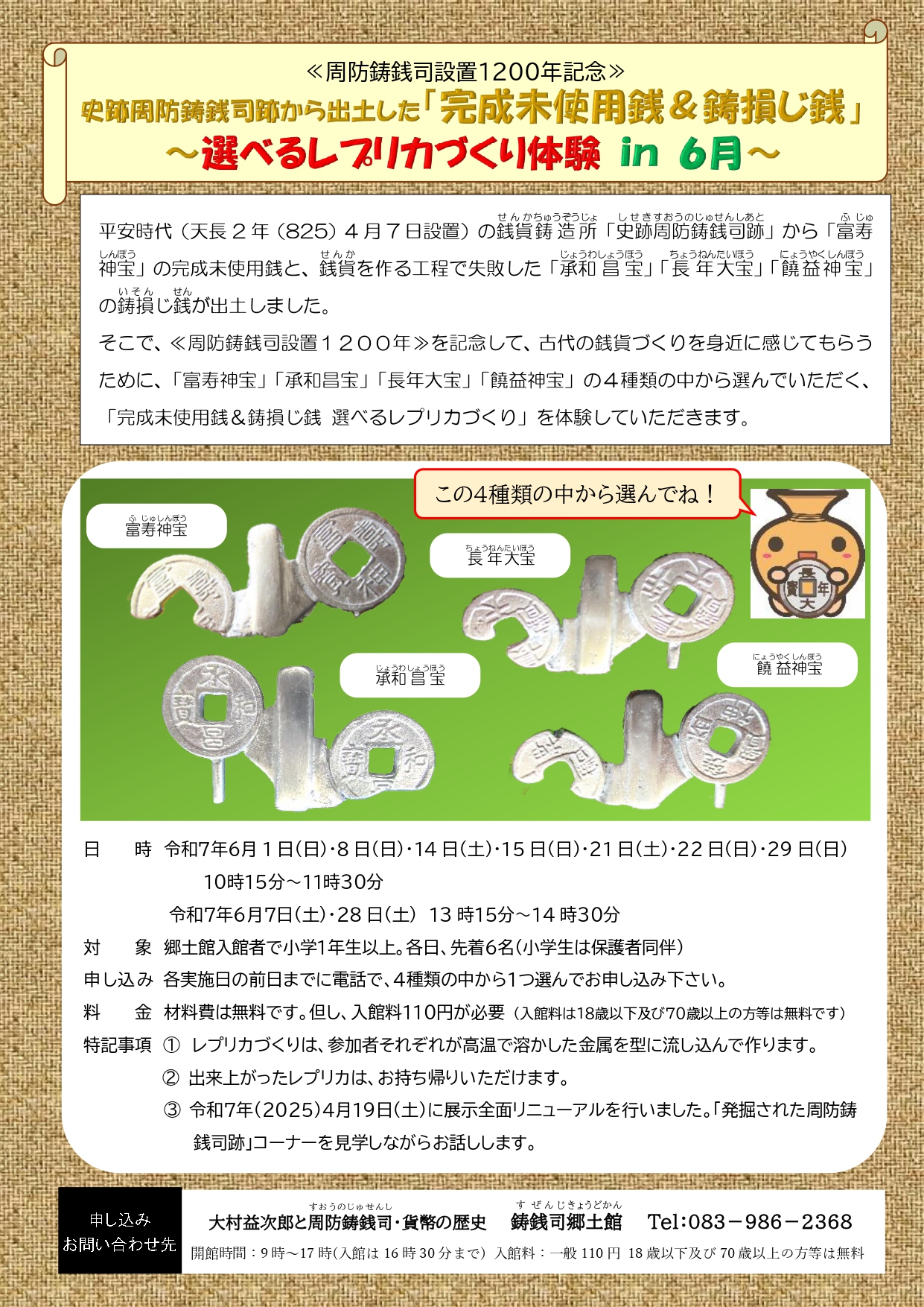 そこで、周防鋳銭司 設置1200年を記念して、古代の銭貨づくりを身近に感じてもらうため、 「 富寿神宝 」「 承和昌宝」 「長年大宝」 「 饒益神宝」 の4種類の中から選び、「 完成未使用銭& 鋳損じ銭 選べるレプリカづくり 」を体験していただきます 。