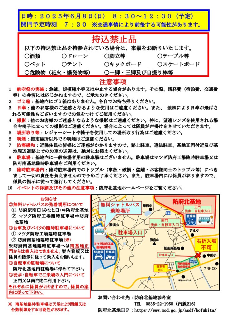 飛行展示、装備品展示、西部航空音楽隊演奏やグッズ販売などの売店コーナー、基地開設70周年特別企画「防府北基地餅まき」などがあります。