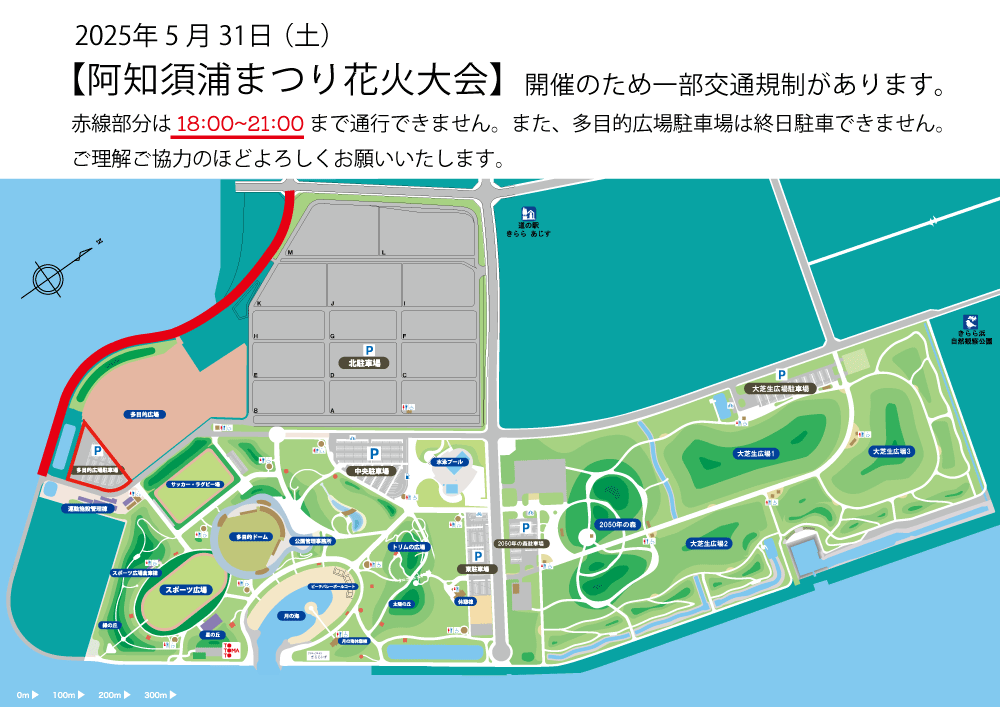 当日は図面のとおり交通規制区域があります。また、多目的広場駐車場は終日駐車できませんのでご注意ください。
