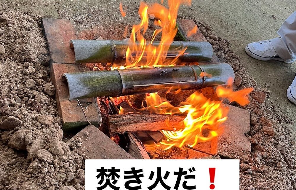 奈良の大仏様の銅をここ長登から献上していることから奈良の大仏のふるさとと言われています。 火起こしはなかなか難しいですよ!ちゃんと指導がありまので頑張って挑戦してね。 その後は皆で楽しくポンプラ飯でお昼ご飯! 長登銅山特製の豚汁もありますよ 自分で頑張って火起こしをしてポンポラ飯を作りましょう