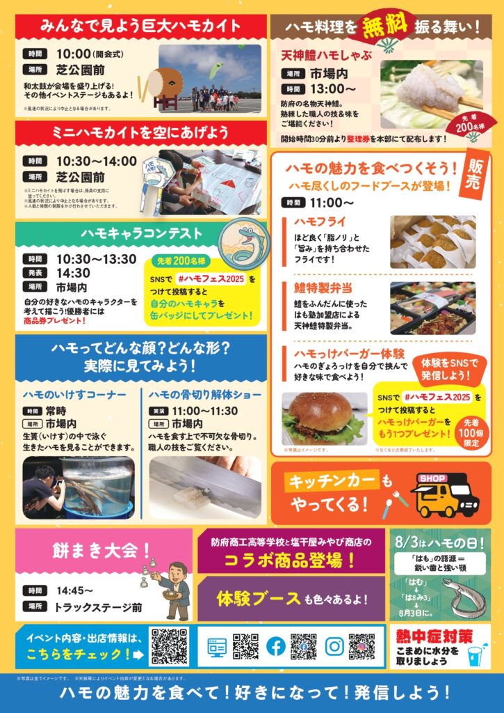 ステージイベントやハモグルメの販売、無料振る舞い、ハモキャラコンテストやハモの骨切り解体ショーなどが行われます。
