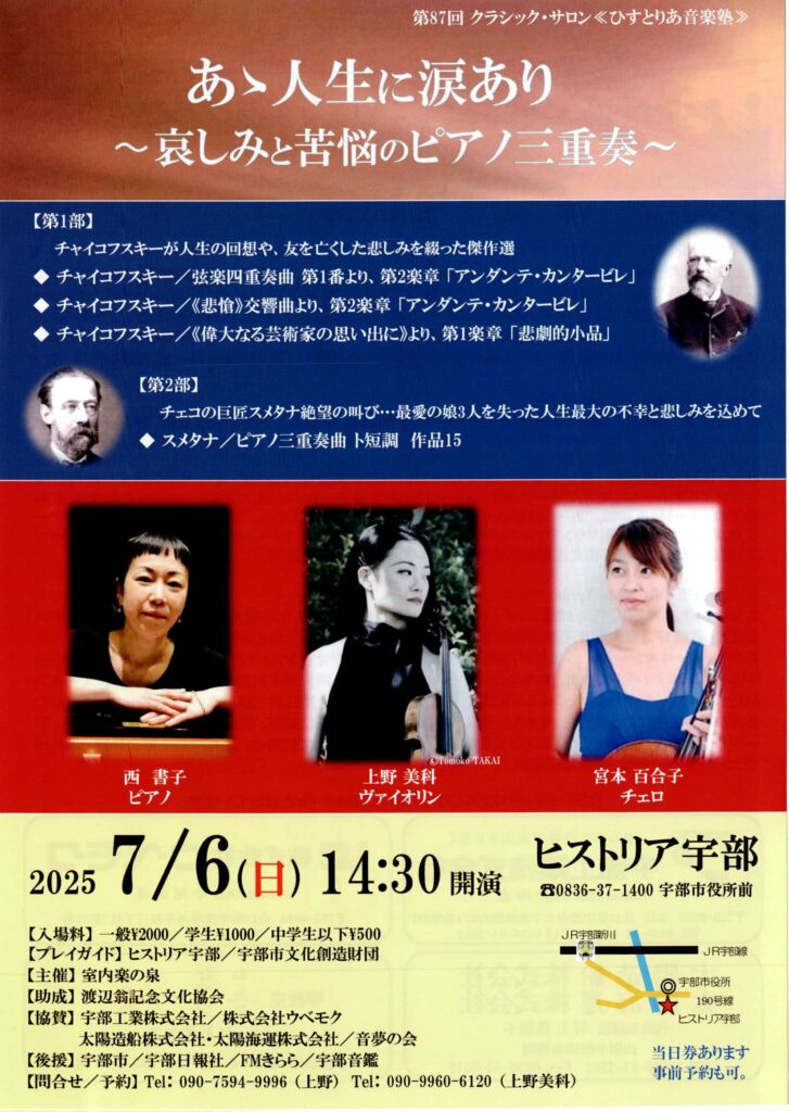 第87回クラシック・サロン《ひすとりあ音楽塾》あゝ人生に涙あり~哀しみと苦悩のピアノ三重奏~を開催します。