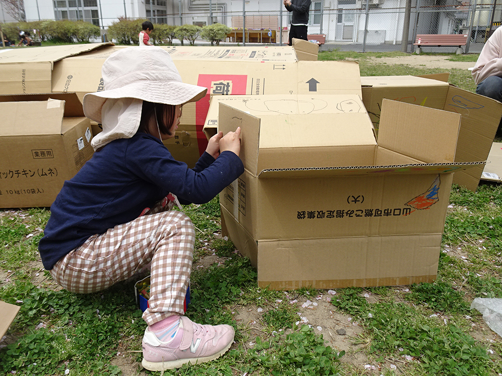なにをしてもいい、なにもしなくてもいい遊び場。やりたいことを見つけてあそぼう。こままわし、けん玉、ダンボール遊び、ジャグリングやフラフープなどいろんなあそびが出来るよ。
