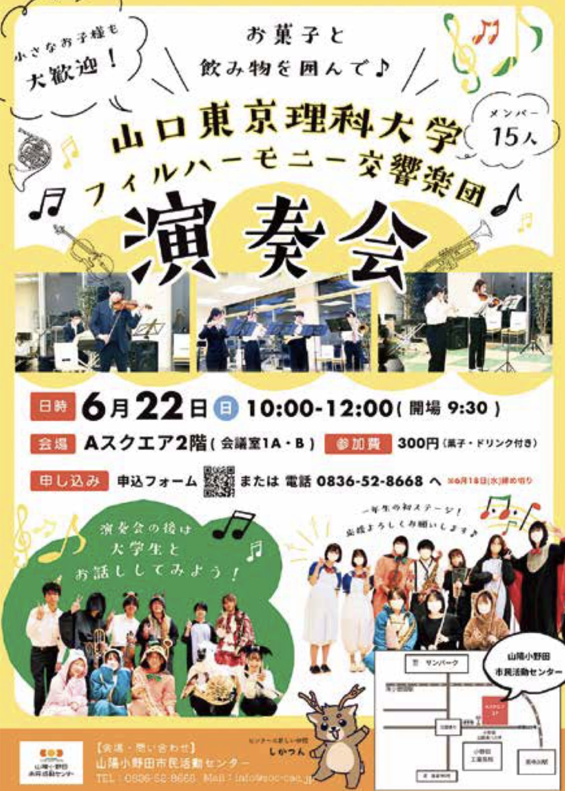 お菓子と飲み物を囲みながら、山口東京理科大学フィルハーモニー交響楽団のメンバー20人による演奏会を楽しみませんか? 演奏会の後は、大学生との交流の場も設けています。親子での参加も可能です。たくさんのご参加お待ちしています。