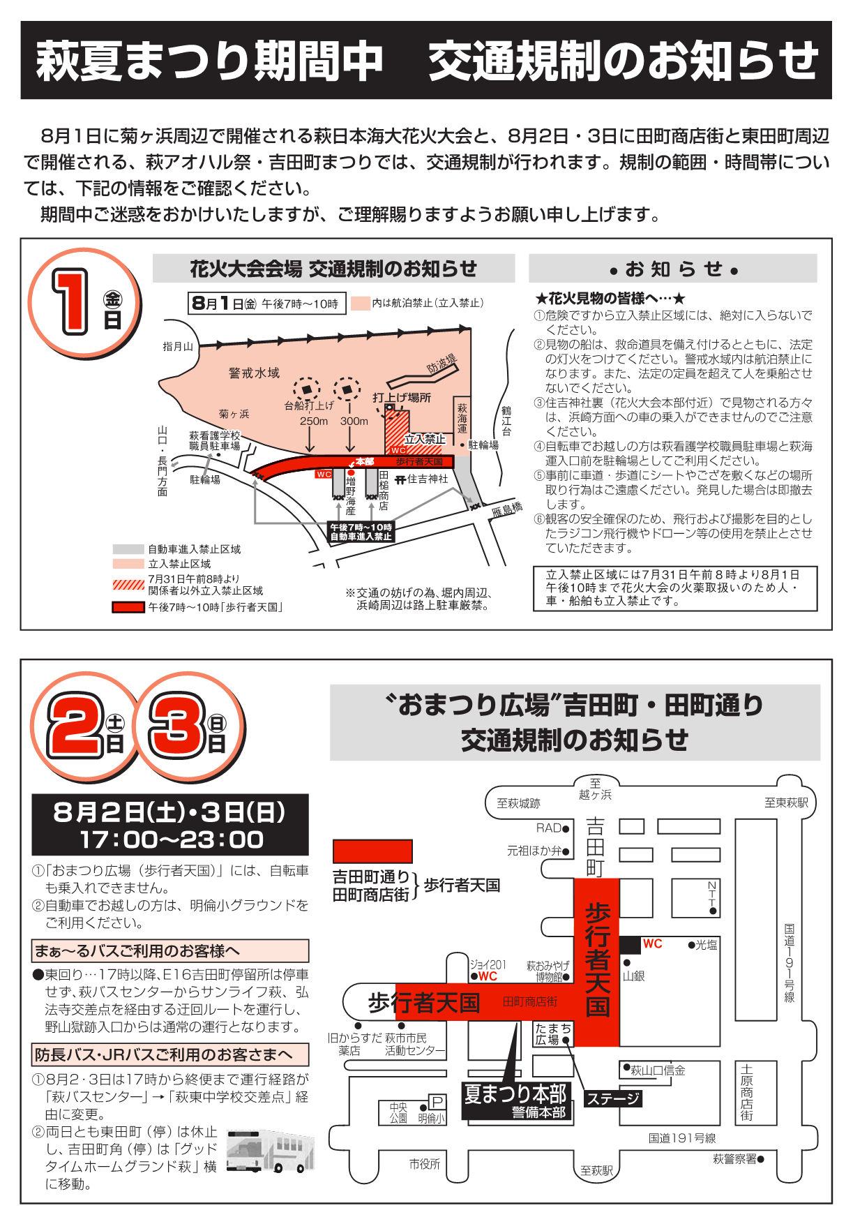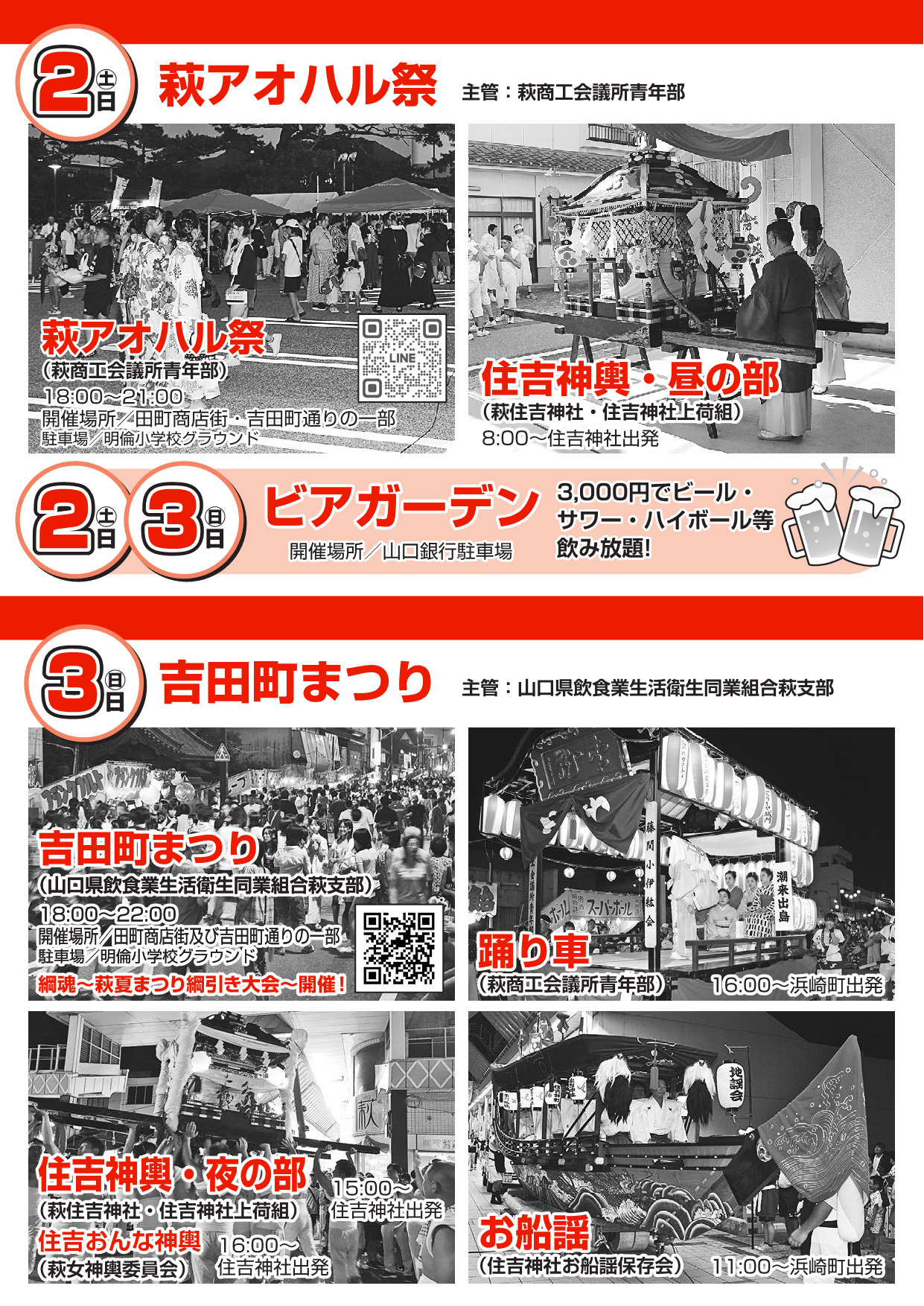 色とりどりの花火が夜空を彩る萩日本海大花火大会(8月1日)、萩アオハル祭(8月2日)、伝統行事【御船謡、住吉みこし、踊り車】の市内巡行(8月2・3日)などが開催されます。