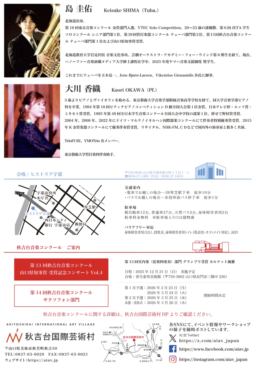 第13回目のテューバ部門で山口県知事賞を受賞した島圭佑による受賞記念コンサートが、ヒストリア宇部で実施されます。
