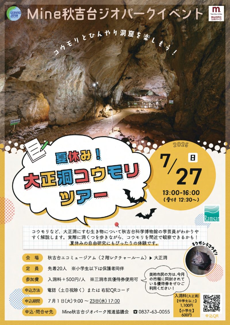 実際に洞窟を歩きながら、コウモリを間近で観察できるかも!夏休みの自由研究にもぴったりな体験です。