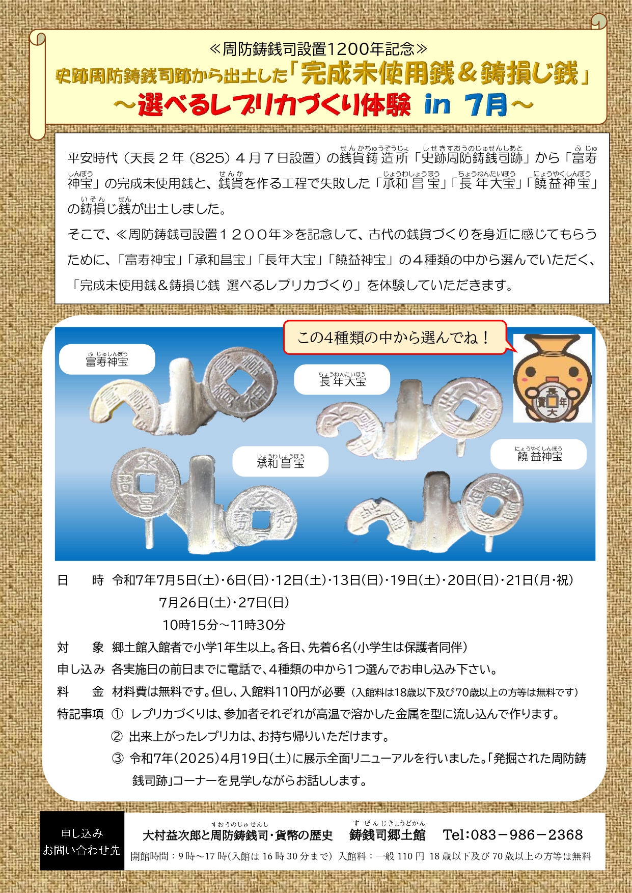 そこで、周防鋳銭司 設置1200年を記念して、古代の銭貨づくりを身近に感じてもらうため、 「 富寿神宝 」「 承和昌宝」 「長年大宝」 「 饒益神宝」 の4種類の中から選び、「 完成未使用銭& 鋳損じ銭 選べるレプリカづくり 」を体験していただきます 。