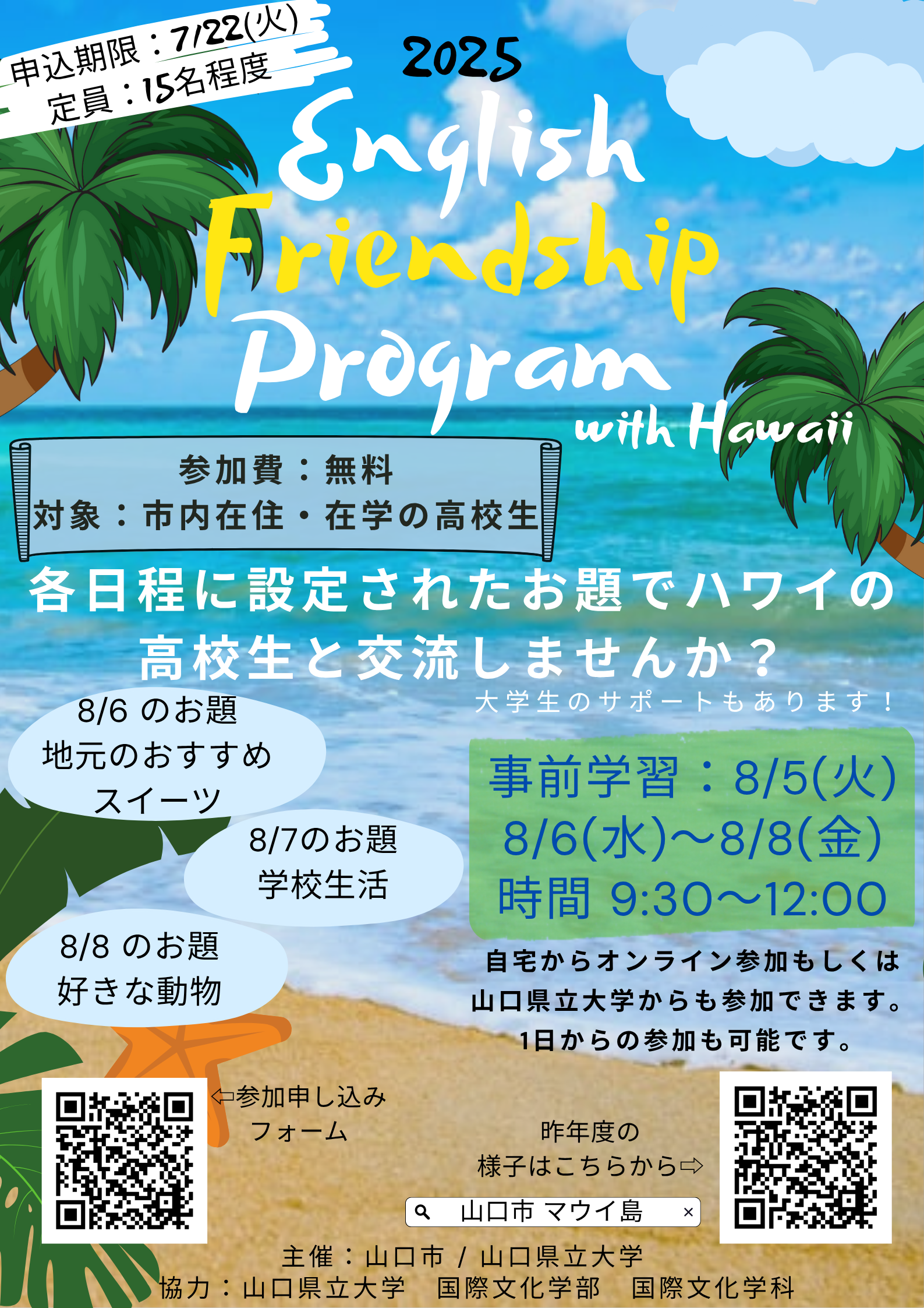 山口市では、日ごろの学習で培った英語力の実践だけでなく、海外の文化を知り、理解するきっかけづくりとするために山口県立大学国際文化学部国際文化学科と協力してハワイ州マウイ島とのオンライン交流を実施しています。