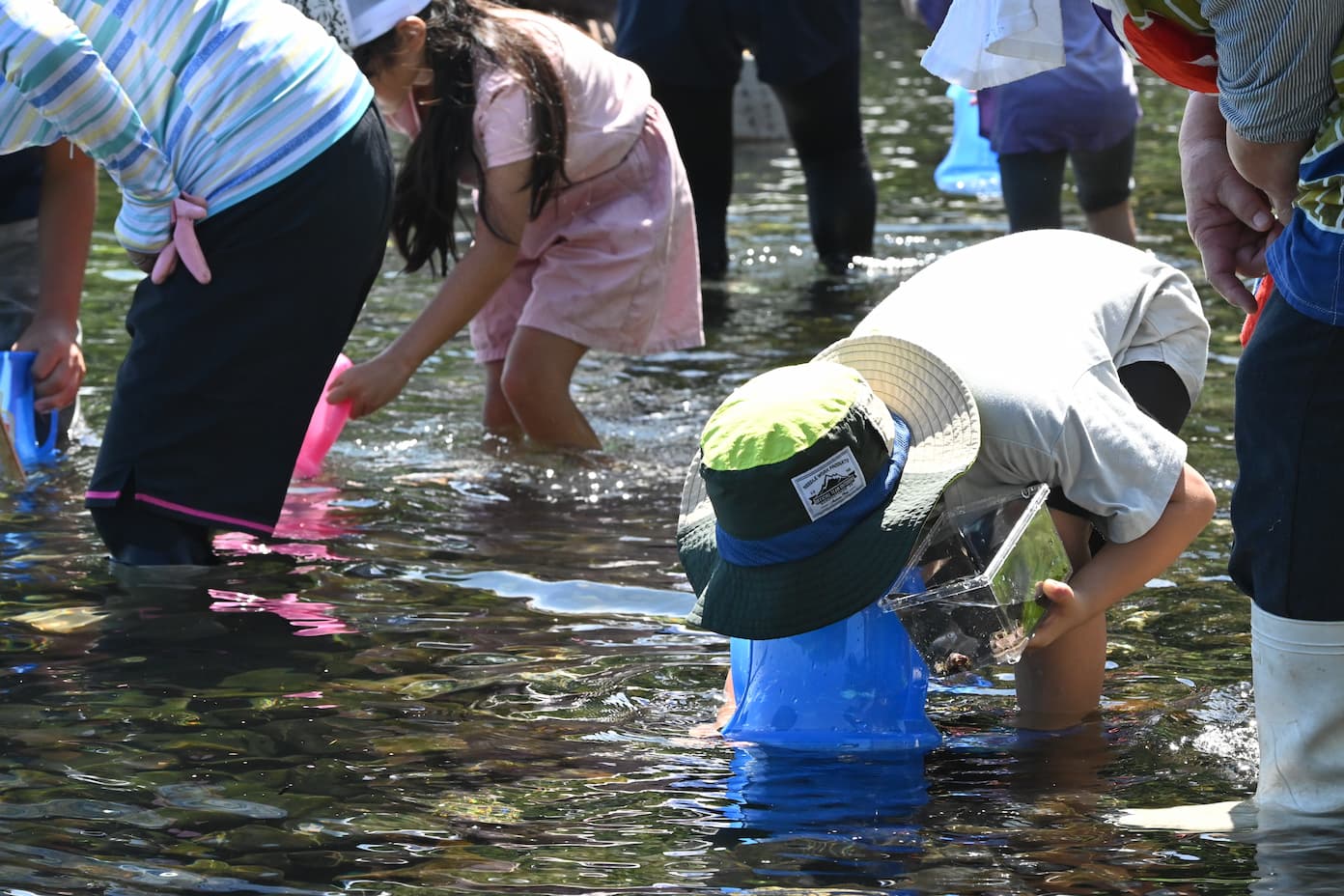 笠山の磯の海にひざまで入り、1万年前の溶岩にひそむ生きたちを観察します。