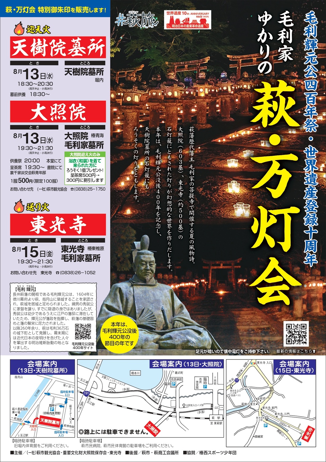 萩の夏の風物詩である「萩・万灯会」は、萩藩主毛利家の菩提寺である大照院と東光寺がその舞台となります。毛利氏の菩提を弔うため、それぞれ500基を超える石灯籠に入れられたろうそくの火が、幻想的な世界を作り出します。