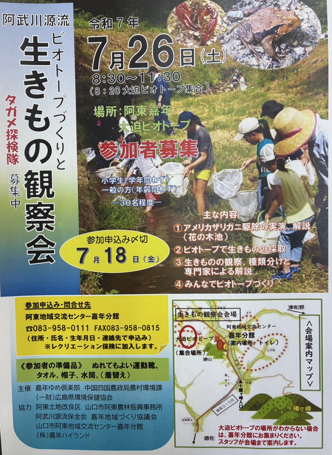阿東嘉年大迫ビオトープにて生きもの観察会を行います!