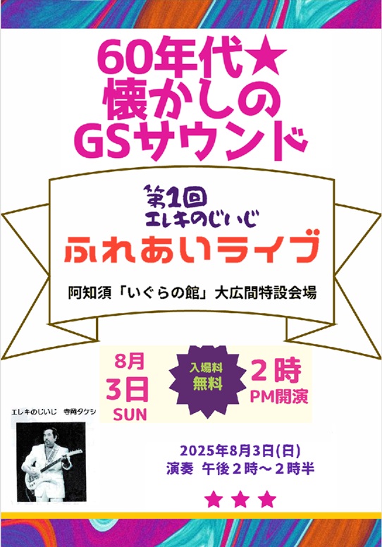 昔懐かしい60年代のGSサウンドを聴き楽しく元気になってもらうコンサート、いぐらの館でエレキじいじが演奏するエレキギター演奏をお聴きください。