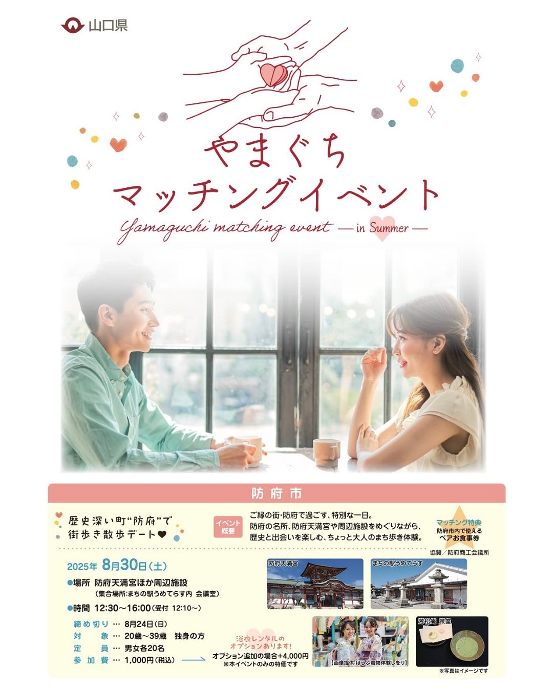 結婚を希望する独身男女の皆様に向けた交流会が防府市(防府天満宮・周辺施設)で開催されます(*˘︶˘*).。.:*♡