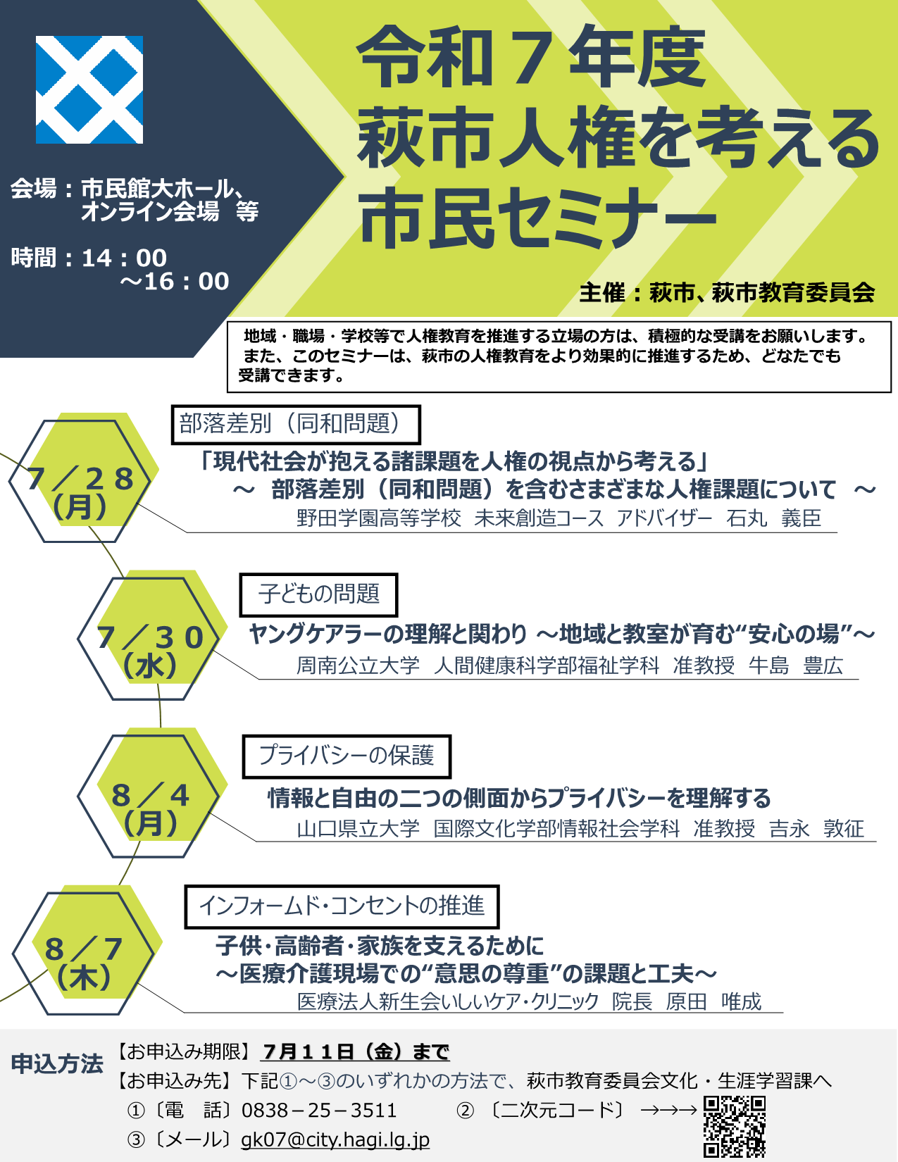 萩市では、市民の方を対象に人権について学ぶ機会を提供して人権意識の向上を図るとともに、人権教育をより効果的に推進するため、地域・職場・学校等で人権教育を推進する立場の方の積極的な受講をお願いしております。