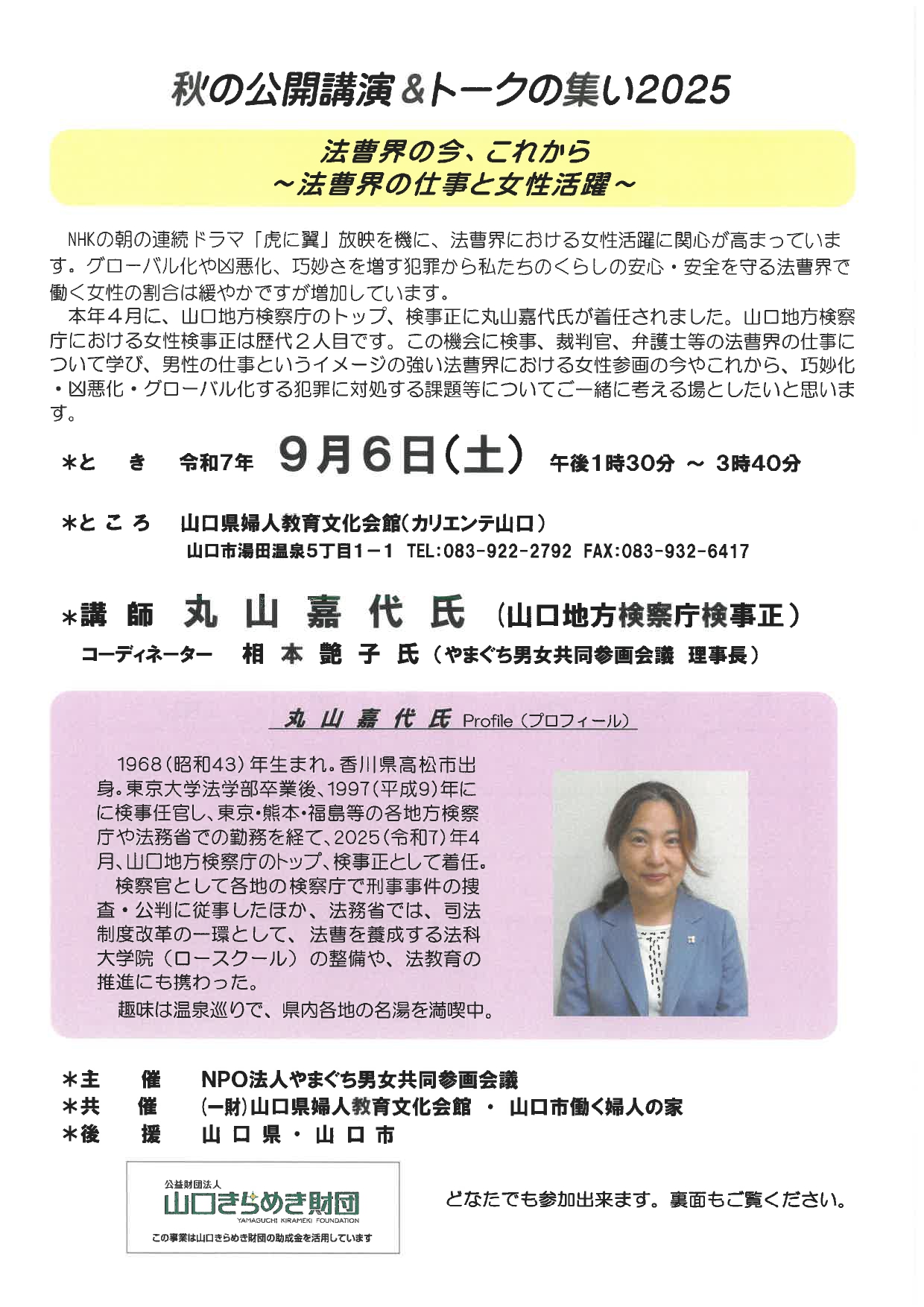 山口地方検察庁歴代2人目の女性検事正として着任された丸山嘉代氏を講師に迎え、法曹界(検事・裁判官・弁護士)における女性活躍の今やこれからについて一緒に考えます。