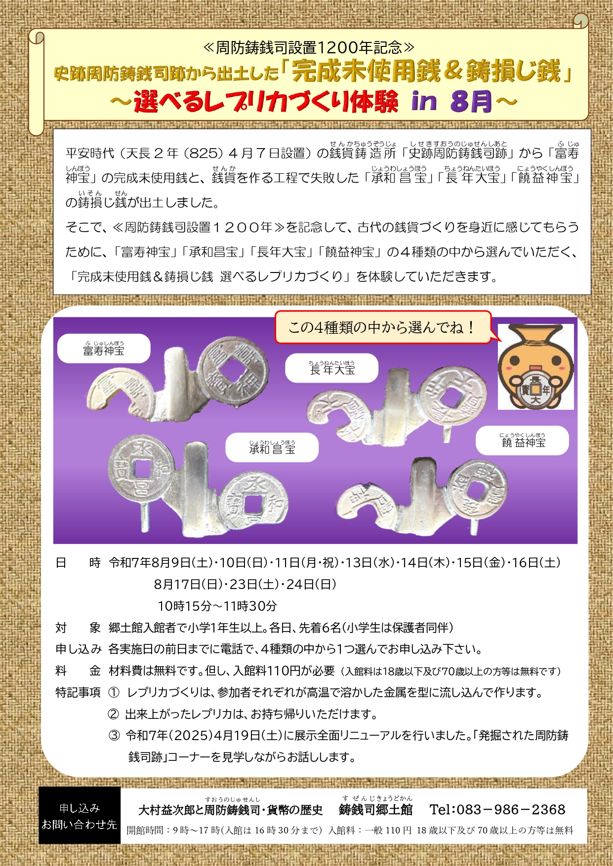 そこで、周防鋳銭司 設置1200年を記念して、古代の銭貨づくりを身近に感じてもらうため、 「 富寿神宝 」「 承和昌宝」 「長年大宝」 「 饒益神宝」 の4種類の中から選び、「 完成未使用銭& 鋳損じ銭 選べるレプリカづくり 」を体験していただきます 。