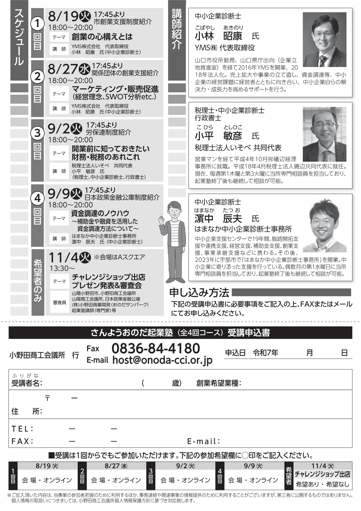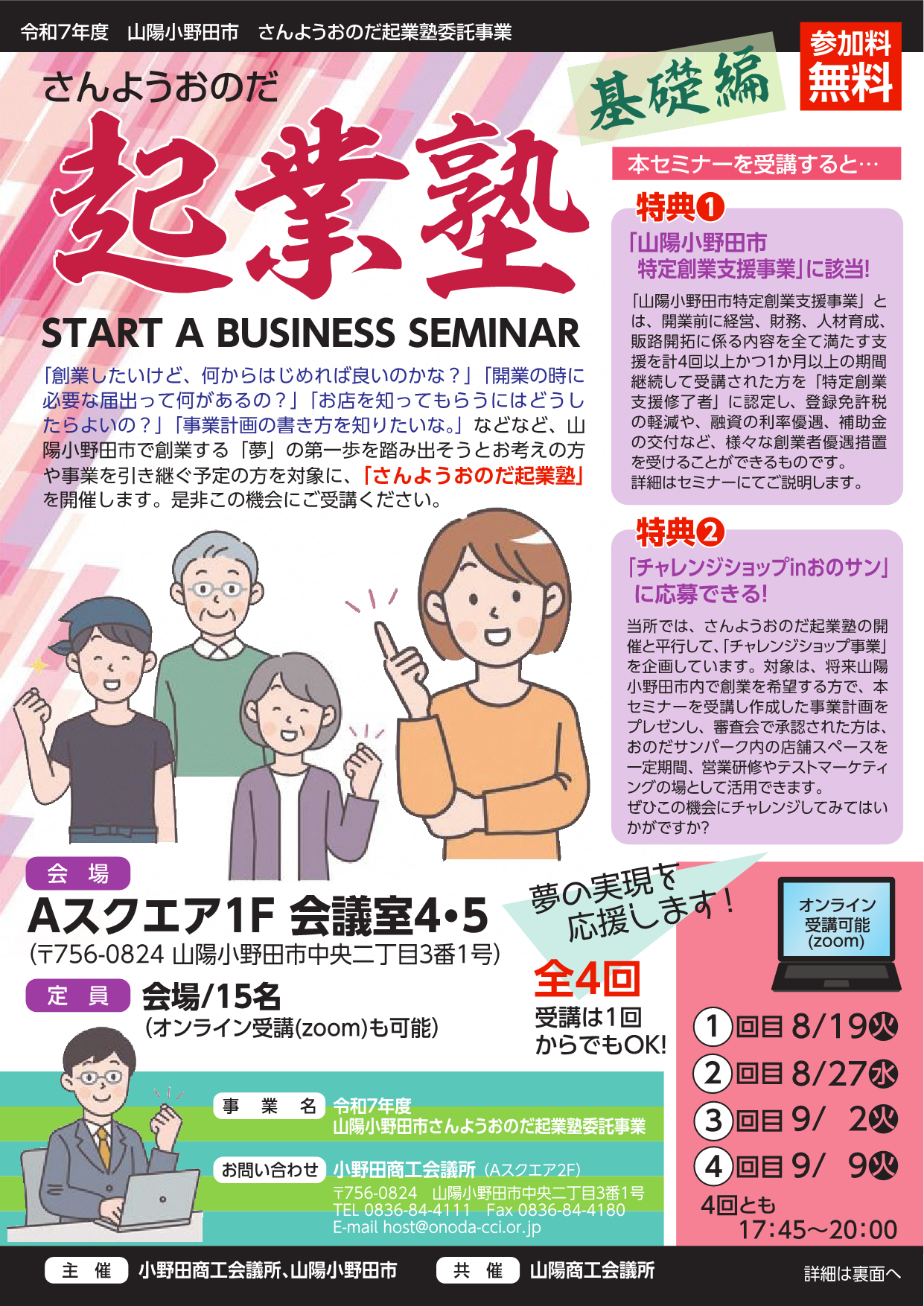 「創業したいけど、何からはじめれば良いのかな?」「開業の時に必要な届出って何があるの」「事業計画の書き方を知りたいな」など、山陽小野田市で創業する「夢」の第一歩を踏み出そうとお考えの方や事業を引き継ぐ予定の方を対象に、「さんようおのだ起業塾」を開催します。