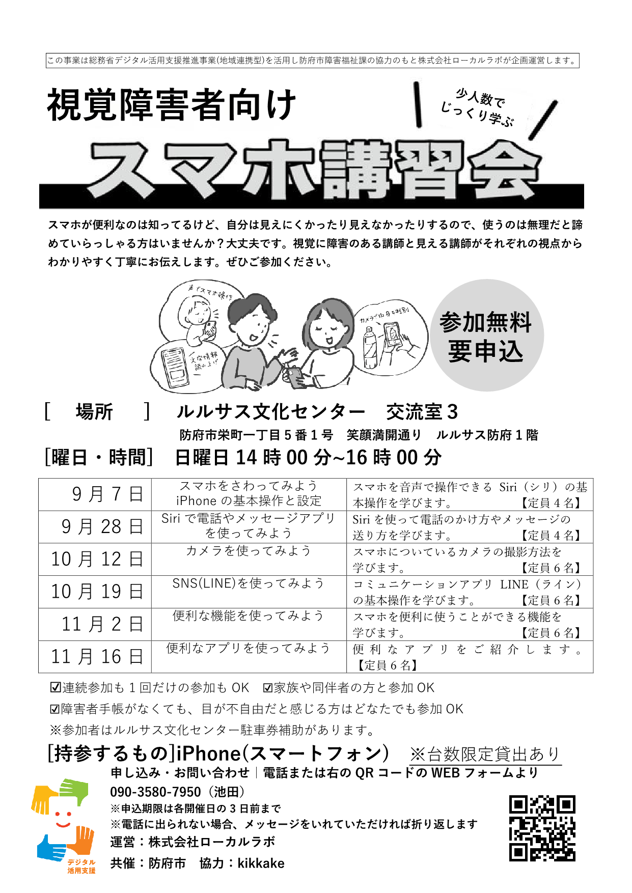 各開催日の3日前までに、電話(090-3580-7950)またはWEBフォームで、(株)ローカルラボへお申し込みください。