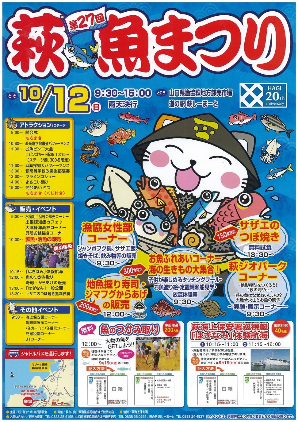 この日に水揚げされた新鮮な活魚や鮮魚の即売コーナー、漁師のおかみさん手作りの「ふぐ鍋」や地魚握り寿司、水産加工品等の販売、ステージイベントなどが行われます。