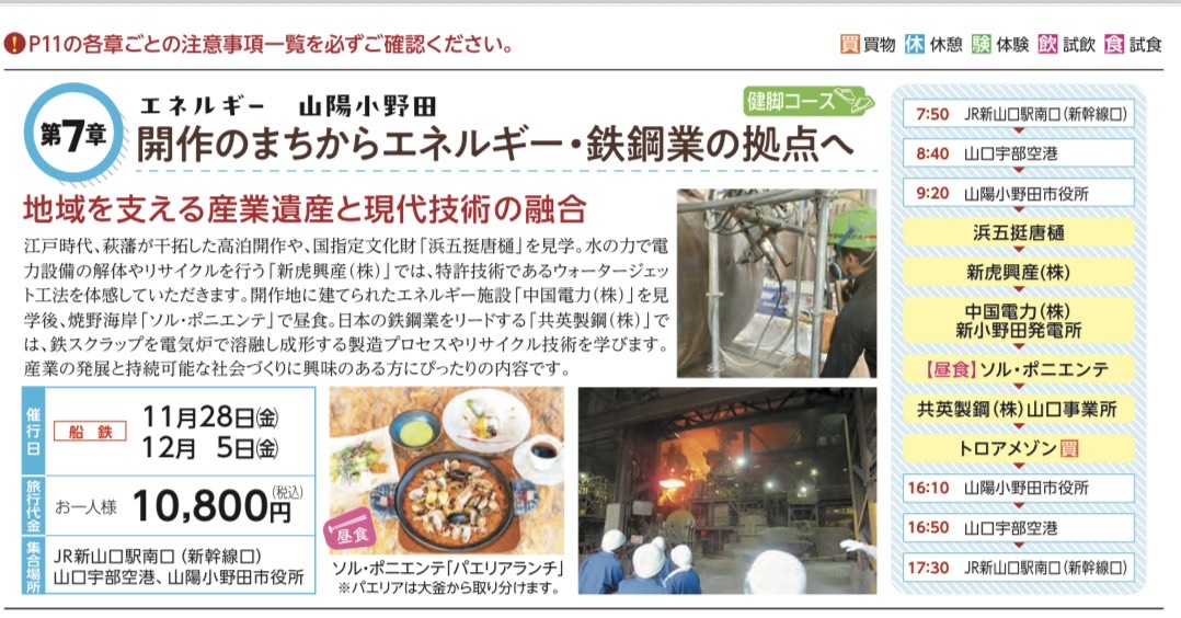 江戸時代、萩藩が干拓した高泊開作や、国指定文化財「浜五挺唐樋」を見学。水の力で電力設備の解体やリサイクルを行う「新虎興産(株)」では、特許技術であるウォータージェット工法を体感していただきます。開作地に建てられたエネルギー施設「中国電力(株)」を見学後、焼野海岸「ソル・ポニエンテ」で昼食。日本の鉄鋼業をリードする「共英製鋼(株)」では、鉄スクラップを電気炉で溶融し成形する製造プロセスやリサイクル技術を学びます。産業の発展と持続可能な社会づくりに興味のある方にぴったりの内容です。