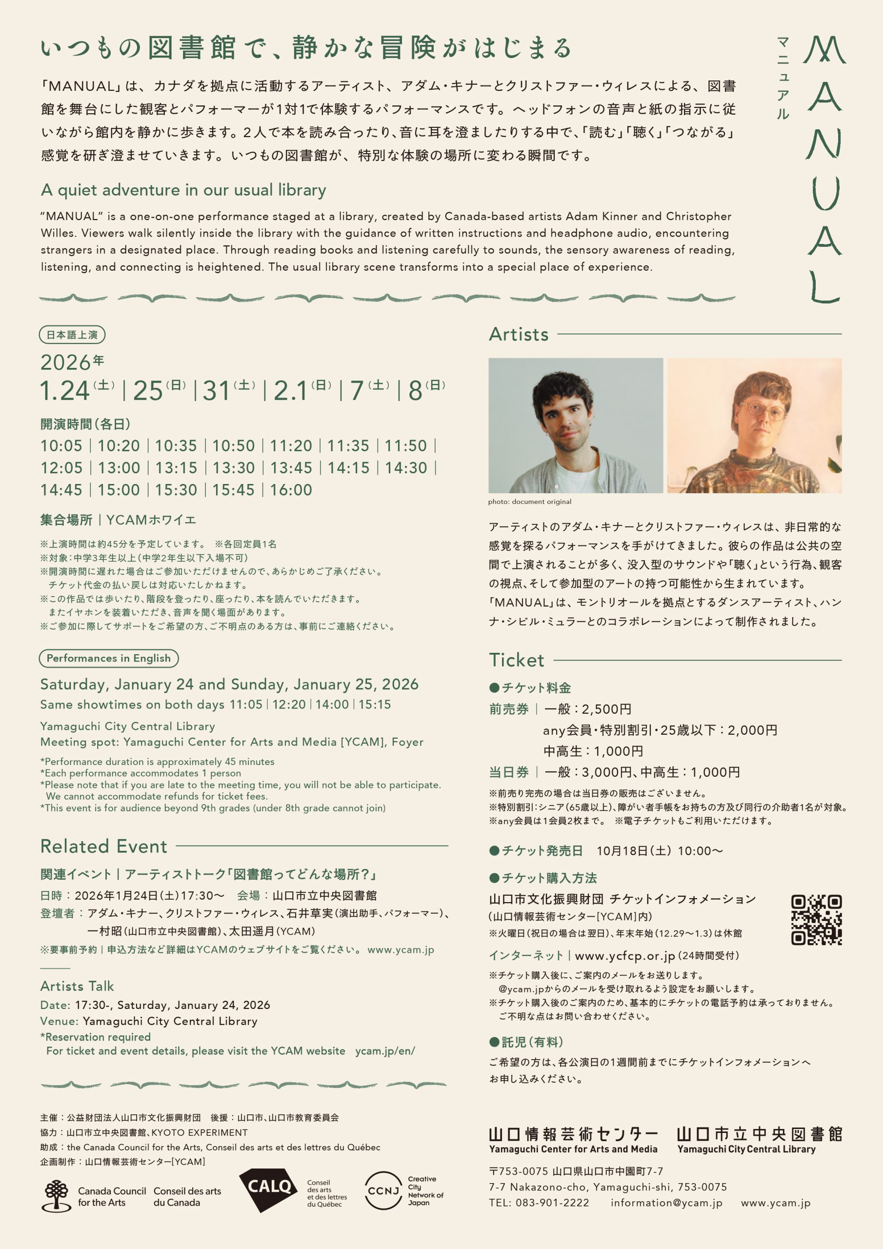 本作は、非日常的な感覚を探る作品を手がけてきた2人のアーティストとダンス・アーティストのハンナ・シビル・ミュラーとのコラボレーションによって生まれた、公共の図書館を舞台としたパフォーマンス作品です。観客とパフォーマーが1対1でおこなう親密な体験型パフォーマンスと、上演する場所ごとに異なる演出が話題を呼び、2022年の初演以降世界各国で上演がおこなわれています。今回の山口での公演は、YCAMに併設する山口市立中央図書館で実施します。