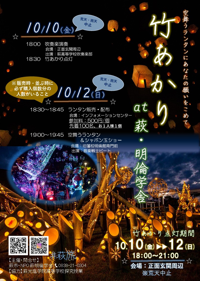 萩・明倫学舎周辺を竹あかりで彩ります。今年は竹のアーチやモニュメントを設置予定。最終日には、萩・明倫学舎がランタンやシャボン玉と共に幻想的な雰囲気に包まれます。