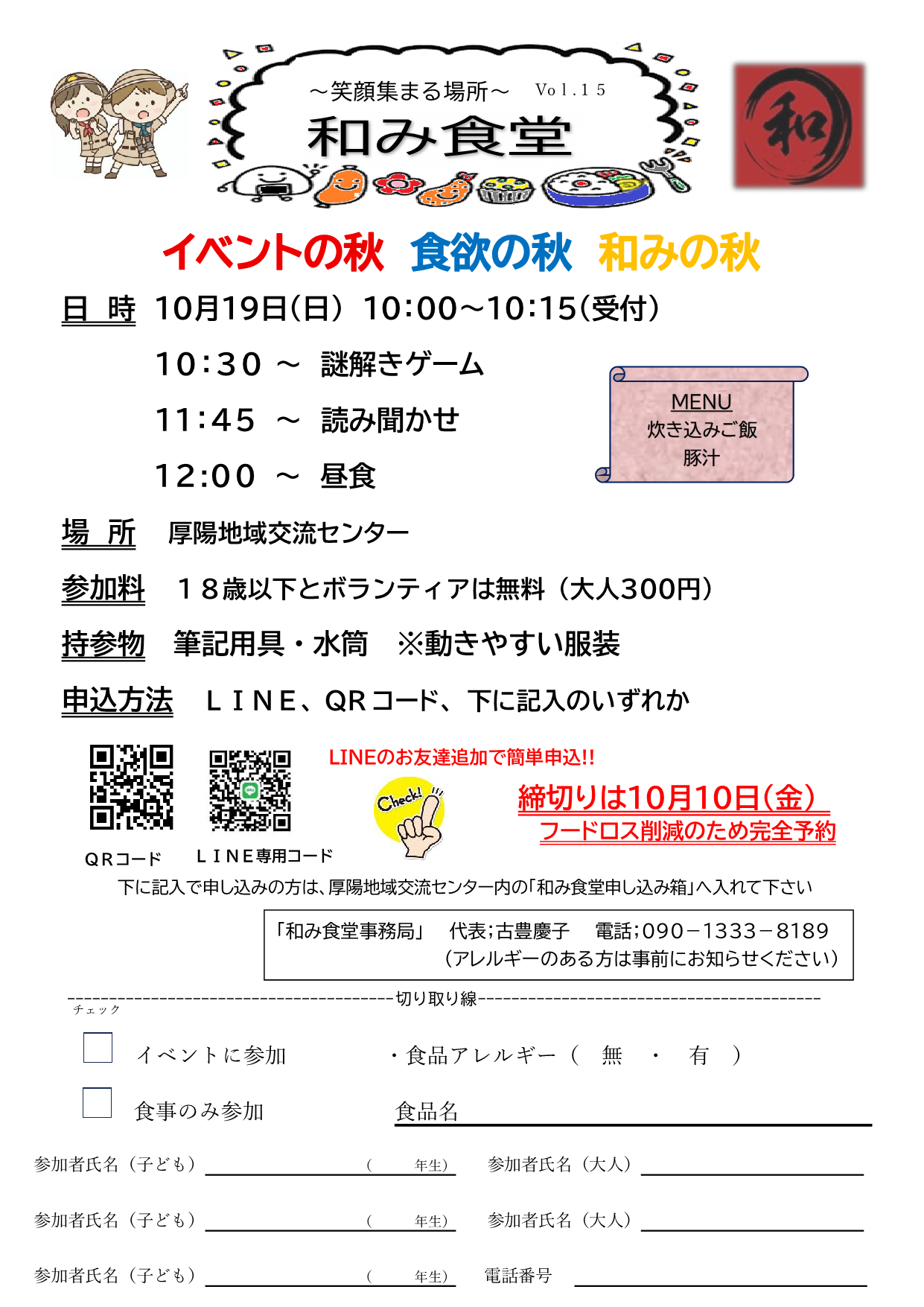 チラシにある、二次元コードを読み込んで、LINEまたはメールで申し込みいただくか、チラシの切り取り線より下の部分を記入し、厚陽地域交流センター内の「和み食堂申し込み箱」に入れてください。