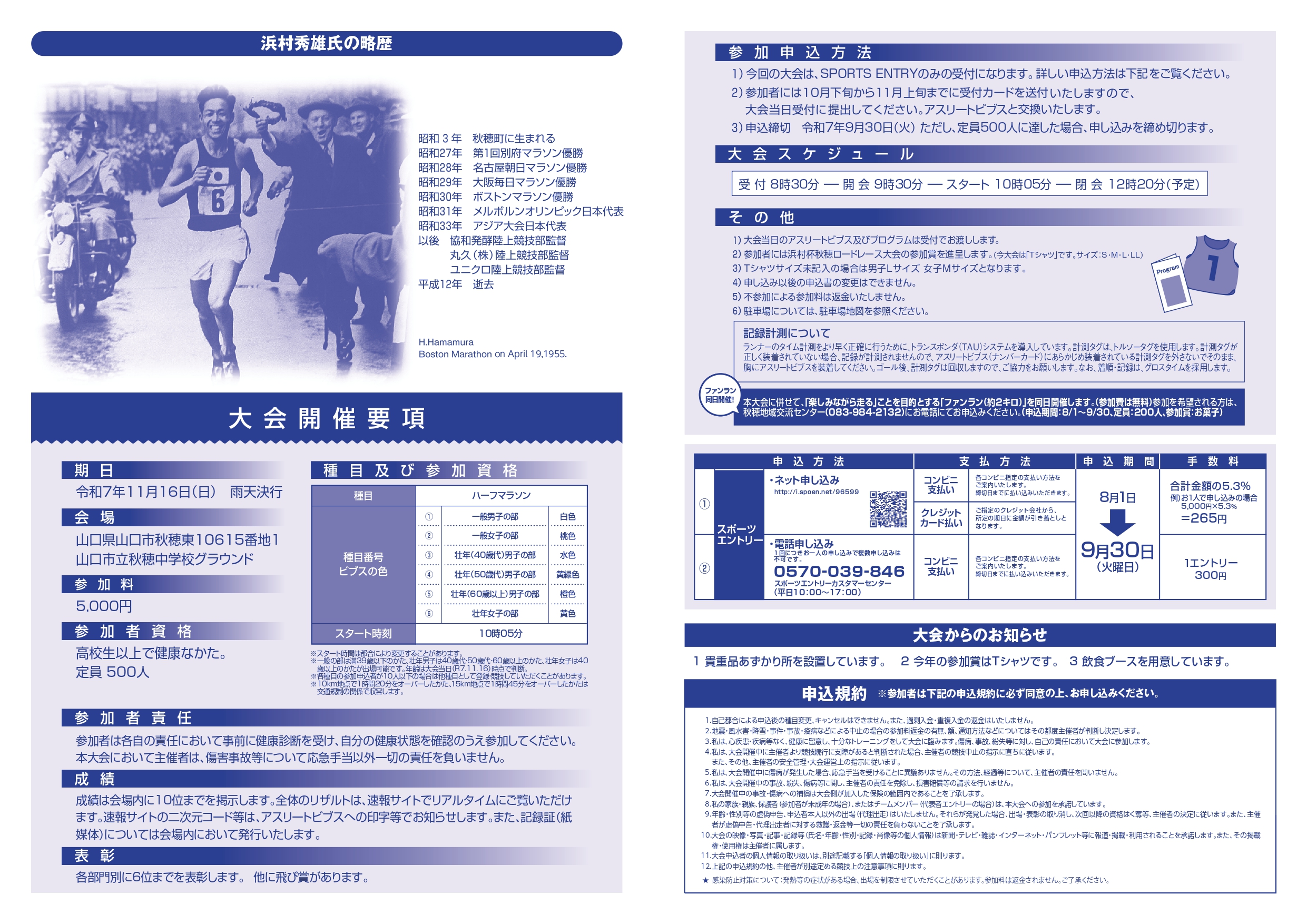 昭和30年ボストンマラソン大会優勝をはじめ、輝かしい実績を残された秋穂地区出身名ランナー「故浜村秀雄氏」の偉業をたたえ開催されます。穏やかな瀬戸内の海と豊かな自然に恵まれたコースで、次代を担うランナーの発掘・育成を目指す特色ある大会です。