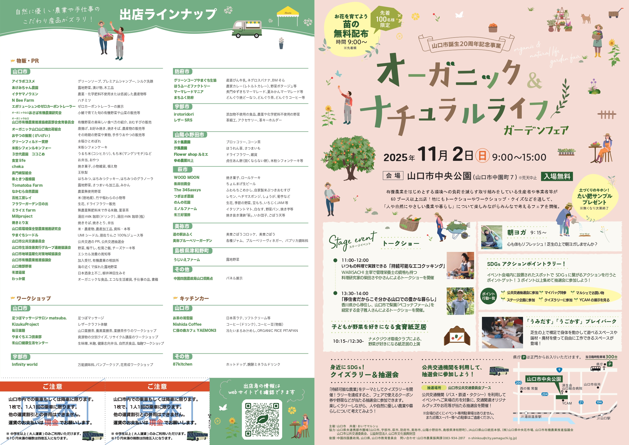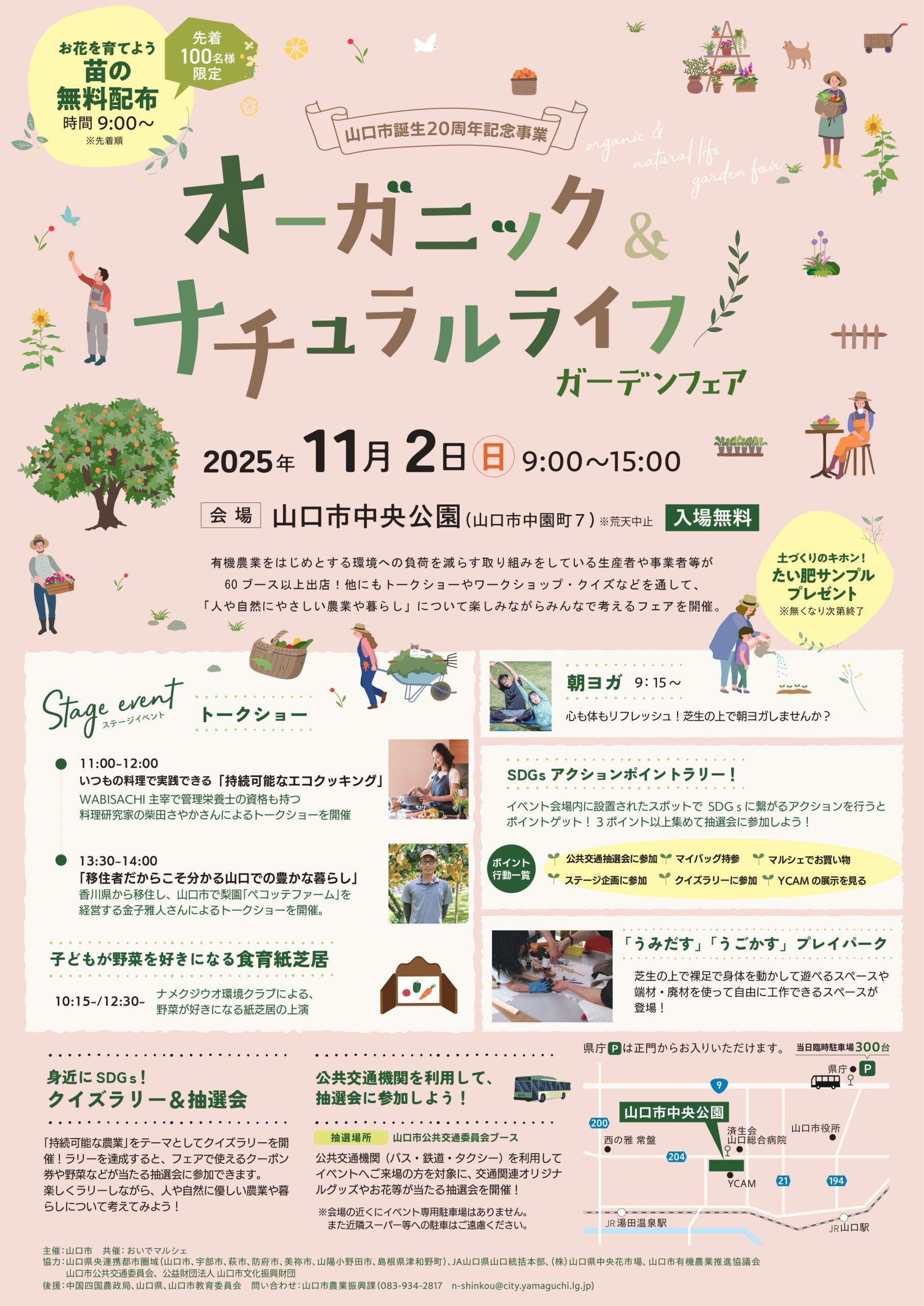 山口市では、人や環境にやさしい農林水産物や、自然を楽しむ暮らしへの取組を市民の皆さんに紹介・提案する中で、環境の負荷低減を図る持続可能な農業や流通・消費について考えていただく機会として、山口県央連携都市圏域(山口市、宇部市、萩市、防府市、美祢市、山陽小野田市、島根県津和野町)や「おいでマルシェ」と連携し、「オーガニック&ナチュラルライフ ガーデンフェア」を開催します。